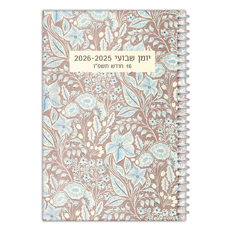 יומן שבועי מהודר לשנת הלימודים תשפ"ו–תשפ"ז (2025–2026), בעיצוב פרחוני עדין בצבעי תכלת ולבן על רקע חום-נחושת חמים. אידיאלי למי שמחפשת יומן פרקטי בשילוב עיצוב על-זמני.