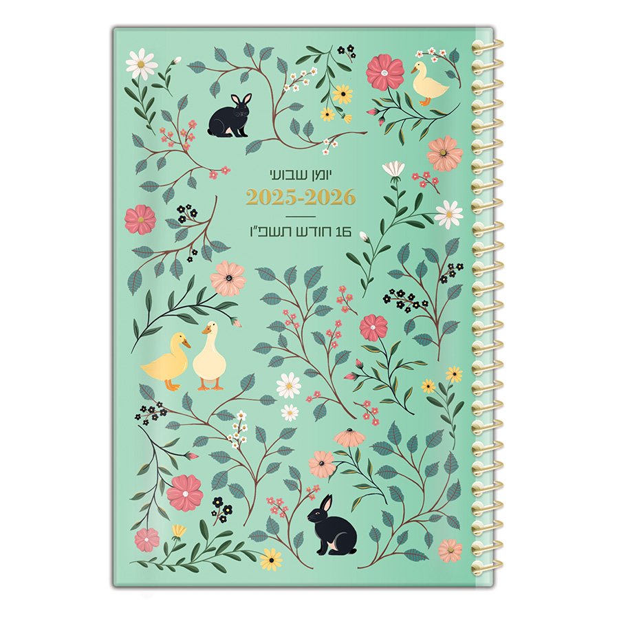 הכניסו טבע, רוגע ושמחה ליומיום שלכם עם יומן שבועי לשנת הלימודים תשפ"ו–תשפ"ז (2025–2026), בעיצוב פסטלי נעים עם איורי פרחים, ברווזים וארנבים שובבים – מושלם לכל גיל ולכל מטרה.