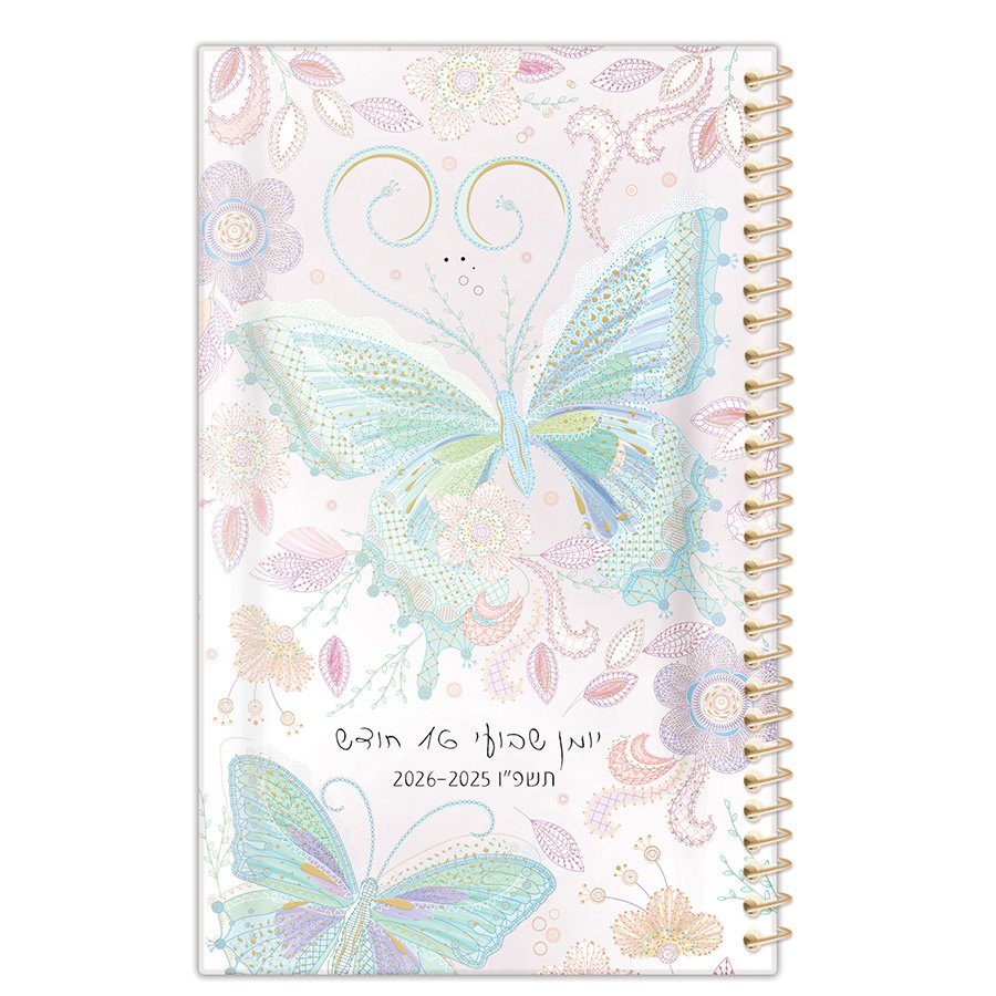 יומן שבועי מהודר לשנת הלימודים תשפ"ו–תשפ"ז (2025–2026) בעיצוב קסום ועדין של פרפרים ופרחים בגווני פסטל – מושלם למי שמחפשת שילוב של סדר, שלווה וסטייל.