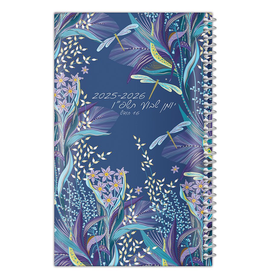 יומן מרהיב בעל עיצוב מהפנט של פרחי בר ושפיריות בתנועה, על רקע כחול עמוק ומרגיע. מעניק תחושת ניקיון וסדר בכל פתיחה.
