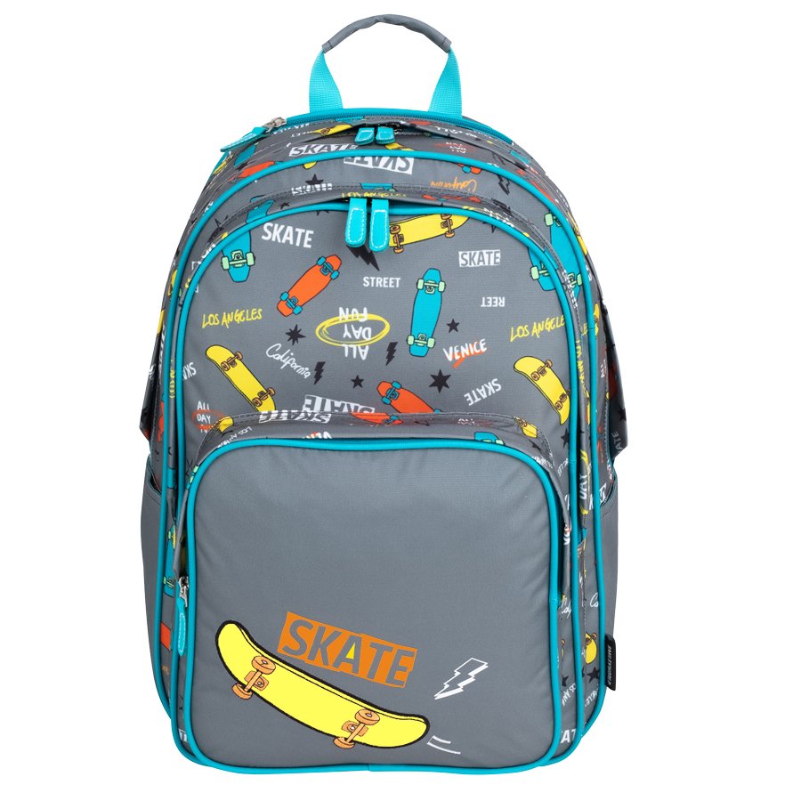 תיק גב מרהיב בצבע אפור עם הדפסי סקייטבורד צבעוניים, מושלם ליום לימודים מלא תנועה.