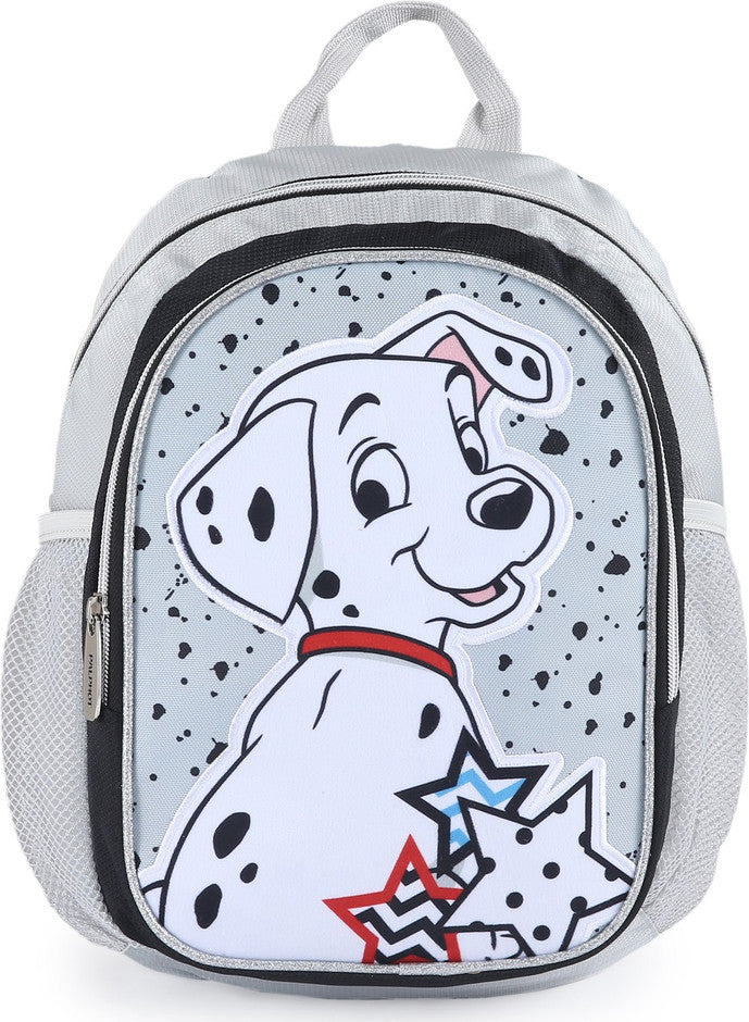 תיק גב קומפקטי לילדים עם עיצוב של כלב דלמטי חמוד על רקע אפור עם נקודות וכוכבים צבעוניים.